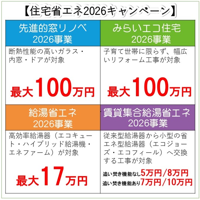住宅の断熱性の向上や住宅省エネ化の支援をする「先進的窓リノベ2026事業」、「給湯省エネ2026事業」、「賃貸集合給湯省エネ2026事業」、「みらいエコ住宅2026事業」の4つの補助金制度「住宅省エネ2026キャンペーン」が開始されます。いずれも条件がありますが、かなり大きな補助額です。